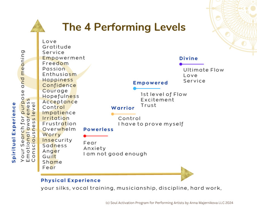 Where horizontal and vertical lines meet as your performing skills develop and your spiritual identity awakens, we find a continuum with four artistic levels. Recognizing these levels isn’t about labeling yourself; it’s about giving you a map, a way to consciously rise into flow rather than hoping it happens by chance.